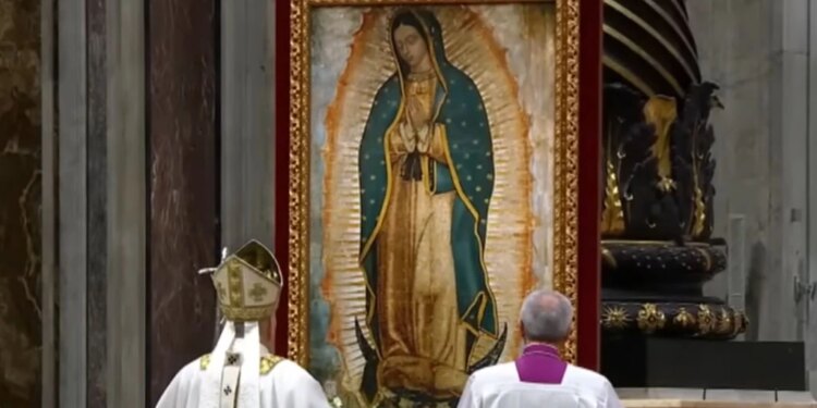 El Papa León XIV reza ante la Virgen de Guadalupe en la Basílica de San Pedro el 12 de diciembre de 2025, tras presidir la Misa en su honor. / Crédito: EWTN.