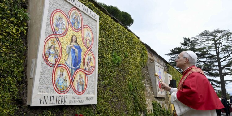 El Papa León XIV bendice un mosaico mariano, con las principales advocaciones de la Virgen María del Perú, en los Jardines Vaticanos, el 31 de enero de 2026. / Crédito: Vatican Media.