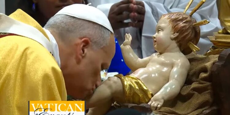 El Papa León XIV besa la imagen del Niño Jesús tras descubrirla, en la Misa de Nochebuena en la Basílica de San Pedro este 24 de diciembre en el Vaticano. / Crédito: EWTN