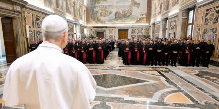 (ZENIT Noticias / Ciudad del Vaticano, 01.03.2026).- El sábado 28 de febrero, en la Sala Clementina del Palacio Apostólico, el Papa León XIV recibió en audiencia especial a seminaristas de diferentes seminarios españoles llegados a Roma para esta audiencia especial. Además de los obispos y formadores de los diferentes seminarios presentes (Alcalá de Henares, Toledo, Interdiocesano de Cataluña y el de Cartagena), participaron también las familias de algunos de los seminaristas. A continuación la transcripción del discurso del Papa: