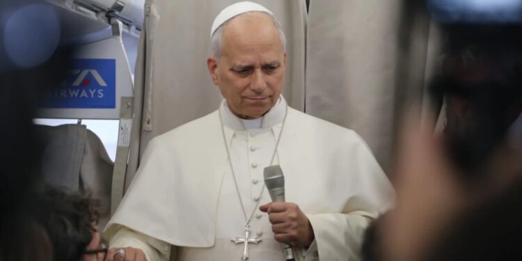 El Papa León XIV en la rueda de prensa en el avión en el que volvió a Roma. / Crédito: Elías Turk / EWTN News.