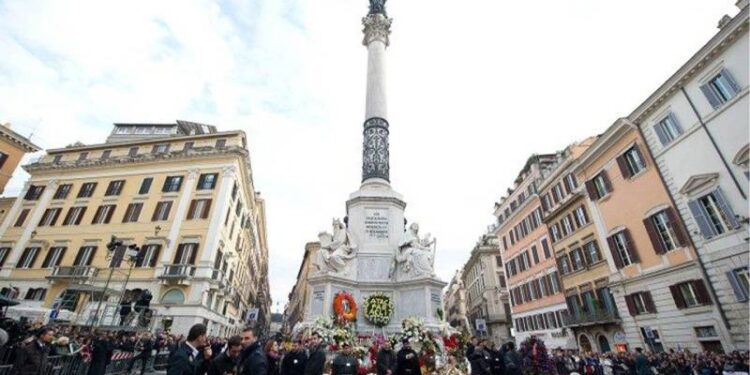 El monumento está justo frente a la Embajada de España ante la Santa Sede, por lo que España actúa simbólicamente como anfitriona de este homenaje mariano. Un país tan ligado a esa advocación y que tuvo tanto que ver con el dogma.