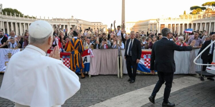 El Papa León XIV saluda a los peregrinos croatas presentes en la Plaza de San Pedro. / Crédito: Vatican Media.