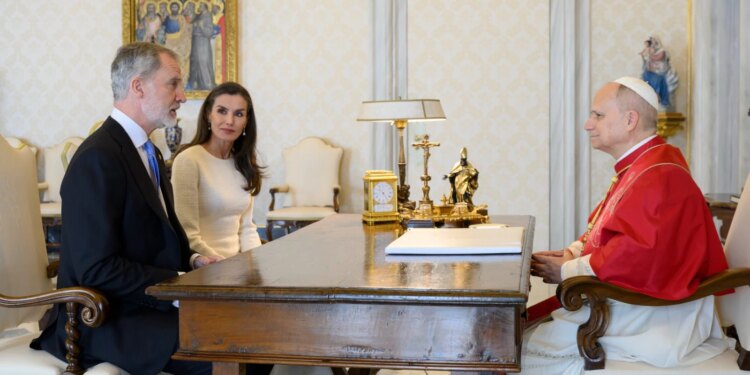 A las 10:14 a.m., quince minutos antes del inicio del encuentro, el coche oficial que transportaba a los Reyes de España llegó al Patio de San Dámaso del Palacio Apostólico, donde ondeaba la bandera española: un gesto habitual cuando un jefe de Estado visita el Vaticano.