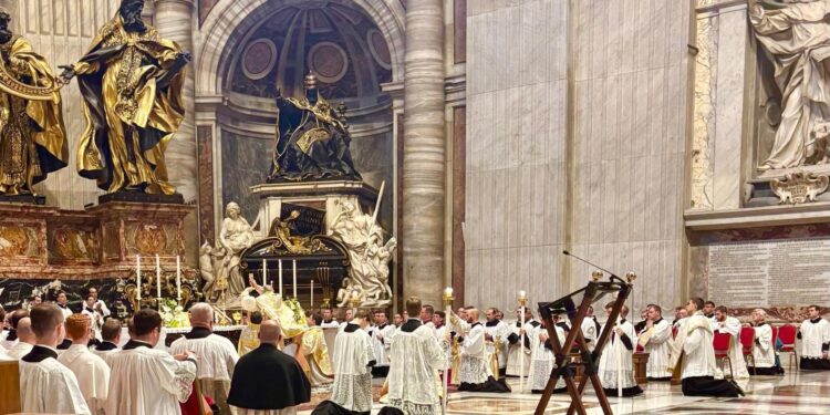 Tras dos años de interrupción, la Misa Pontifical según el rito romano tradicional volvió a celebrarse esta tarde en la Basílica de San Pedro, en el Altar de la Cátedra, situado en el ábside y segundo en importancia del templo vaticano. La celebración fue presidida por el cardenal Raymond Leo Burke y reunió a más de 2.500 fieles y peregrinos de todo el mundo, en el marco de la peregrinación anual Summorum Pontificum ad Petri Sedem.