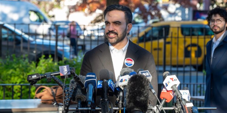 El candidato demócrata a la alcaldía de la ciudad de Nueva York (Estados Unidos), Zohran Mamdani, habla con los medios de comunicación después de emitir su voto en las elecciones generales frente a la escuela secundaria Frank Sinatra el 4 de noviembre de 2025 en la ciudad de Nueva York. / Crédito: Ron Adar / Shutterstock.