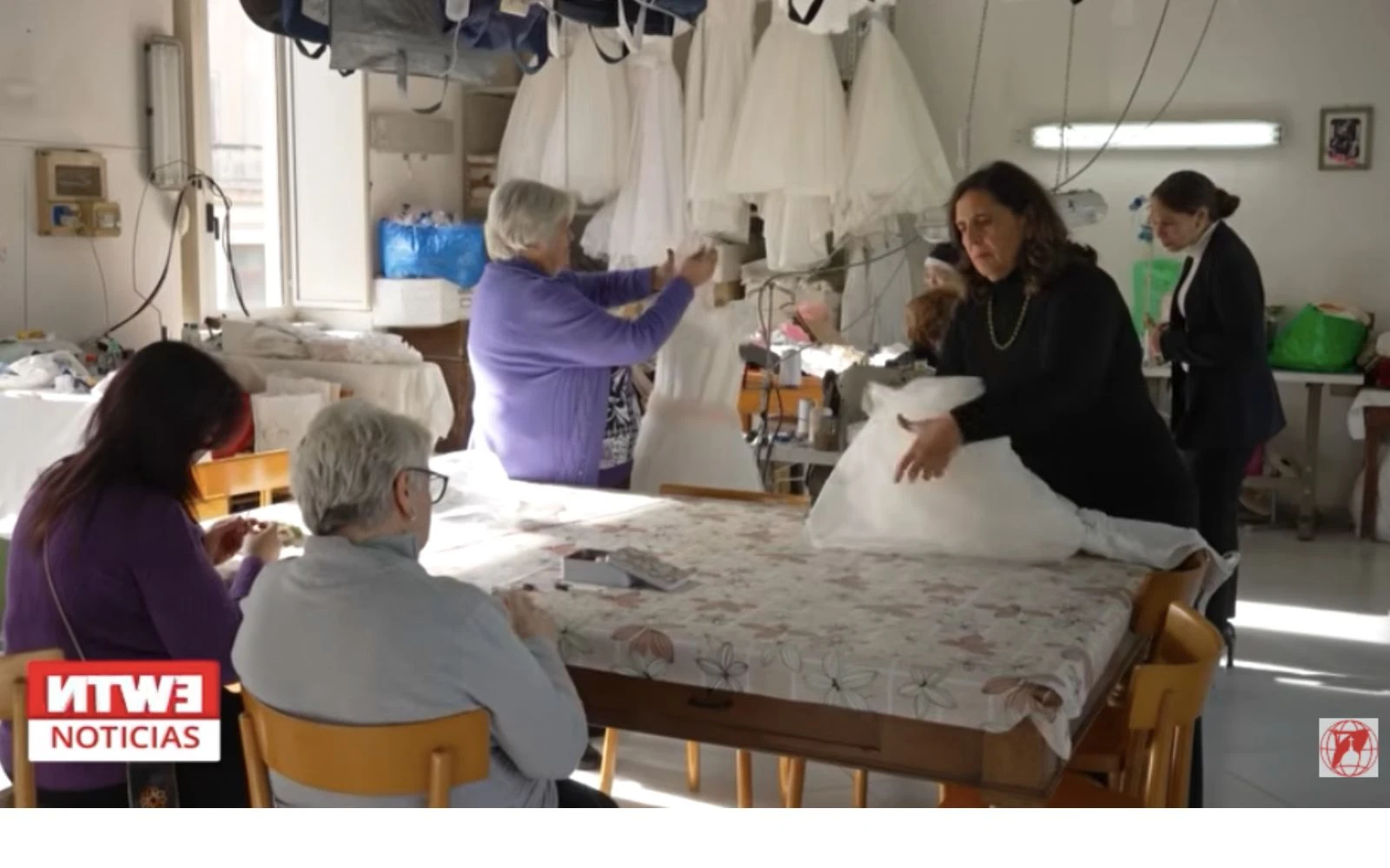 Voluntarias trabajan en el taller de vestidos de novia en el interior del Santuario de Pompeya / Crédito: Captura de vídeo de EWTN Noticias
