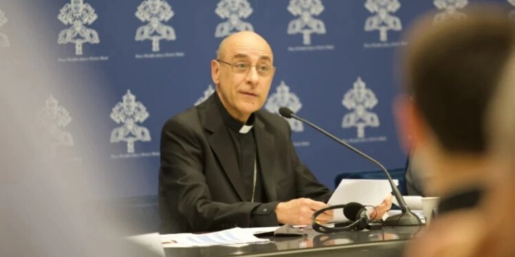 El Cardenal Víctor Manuel Fernández, prefecto del Dicasterio para la Doctrina de la Fe, preside una conferencia de prensa el viernes 17 de mayo de 2024 sobre el nuevo documento del Vaticano acerca de las apariciones marianas. / Crédito: Rudolf Gehrig – EWTN News