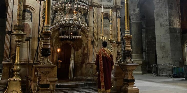Un sacerdote armenio ortodoxo en una oración en el edículo en la iglesia del Santo Sepulcro / Crédito: Victoria Cardiel/EWTN News