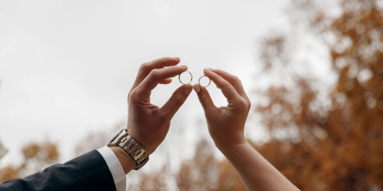 Imagen referencial de novios católicos sosteniendo sus aros de matrimonio. / Crédito: Shutterstock