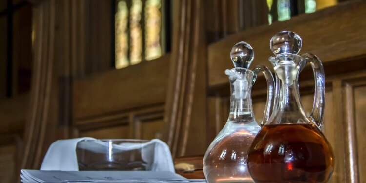 Vino y agua, contenidos en vinajeras para el ofertorio, que serán presentados y consagrados durante la Misa. / Crédito: iweta0077/Shutterstock.