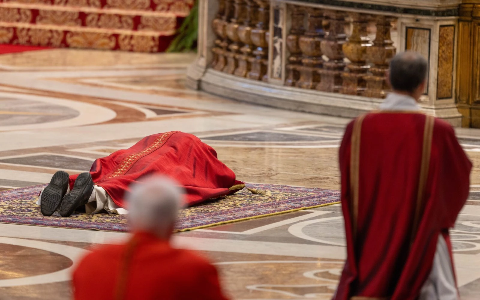 Al inicio de la liturgia del Viernes Santo en la que se conmemora la Pasión del Señor, el Papa se postra ante el altar mientras todos se arrodillan en silencio. Luego reza: