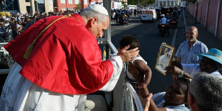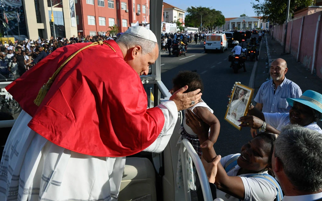 El Papa León XIV bendice un niño en Angola / Crédito: Vatican Media.