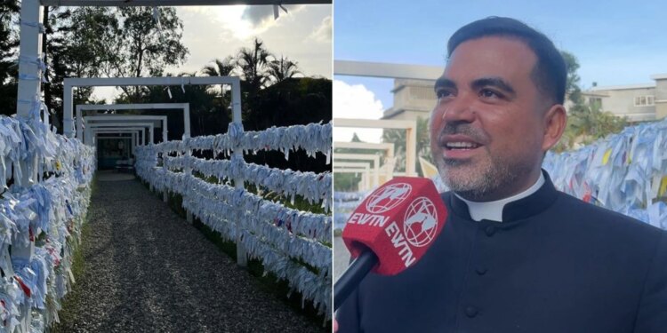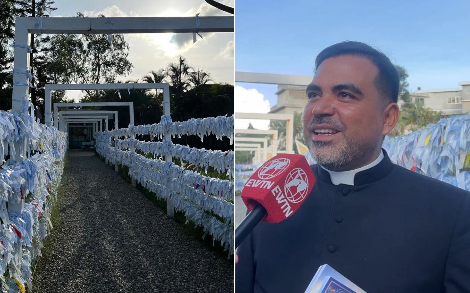 Izq: Cintas blancas con peticiones de los devotos a la Virgen Desatanudos. Der: El P. José Ángel Torres. / Crédito: Andrés Henríquez/EWTN.
