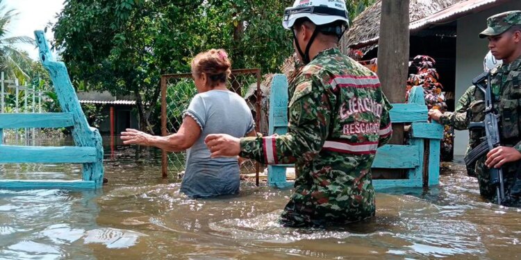 La Gobernación de Córdoba (Colombia) informó el 9 de febrero que miembros de las Fuerzas Militares llegaron al corregimiento La Madera de San Pelayo para evacuar a las familias atrapadas por las inundaciones. / Crédito: Gobernación de Córdoba (Colombia).