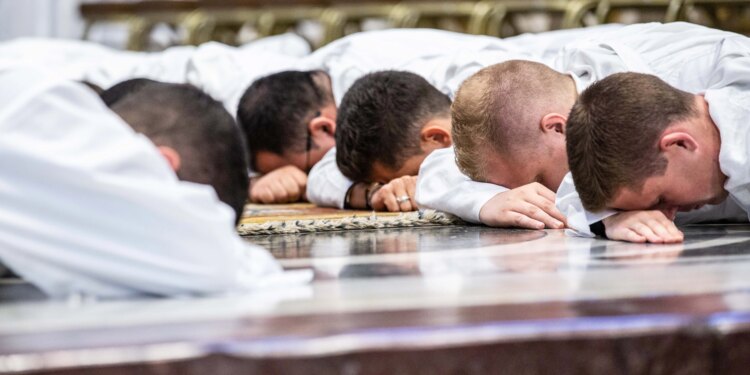 Varios presbíteros se postran durante la ceremonia de ordenación sacerdotal. / Crédito: Daniel Ibáñez / ACI Prensa