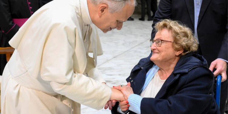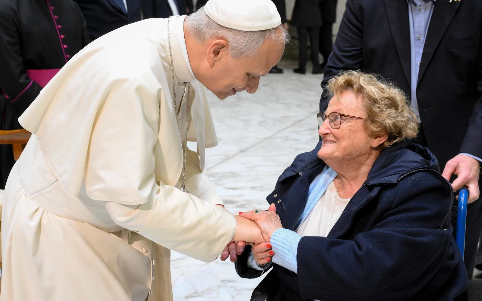 Imagen referencial del Papa León XIV con una señora mayor durante la Audiencia General / Crédito: Vatican Media