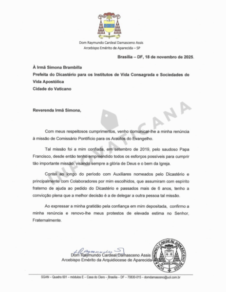 Como adelantaba esta mañana nuestra Specola, el cardenal Raymundo Damasceno Assis, arzobispo emérito de Aparecida, ha presentado su renuncia al cargo de Comisario Pontificio de los Heraldos del Evangelio, responsabilidad que ejercía desde septiembre de 2019. Infovaticana publica en exclusiva la carta, fechada el 18 de noviembre de 2025 y dirigida a la prefecta del Dicasterio para los Institutos de Vida Consagrada, Sor Simona Brambilla, comunica su decisión sin detallar los motivos que la impulsan.