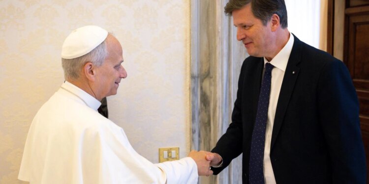Eduard Habsburg, embajador de Hungría ante la Santa Sede de 2015 a 2025, se despide durante una visita al Papa León XIV el 21 de noviembre de 2025. / Crédito: Vatican Media.