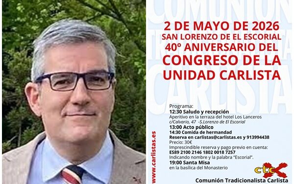 Lo que vamos a celebrar el 2 de mayo en San Lorenzo de El Escorial son los 40 años de un acontecimiento que fue importante en la historia reciente del Carlismo. En 1986 es cuando se reconstituyó la actual Comunión Tradicionalista Carlista con la fusión de Comunión Tradicionalista, Unión Carlista y Comunión Católico-Monárquica.
