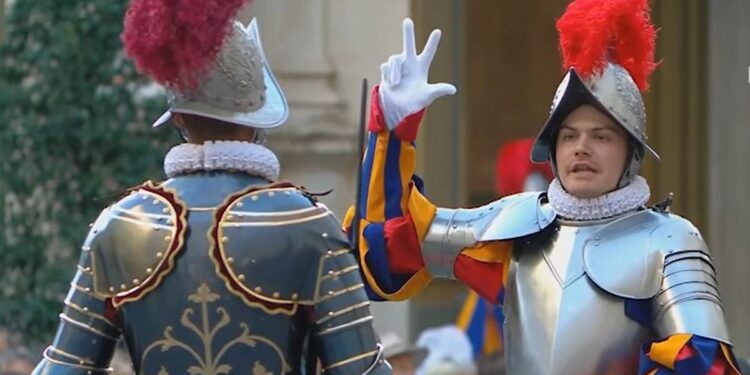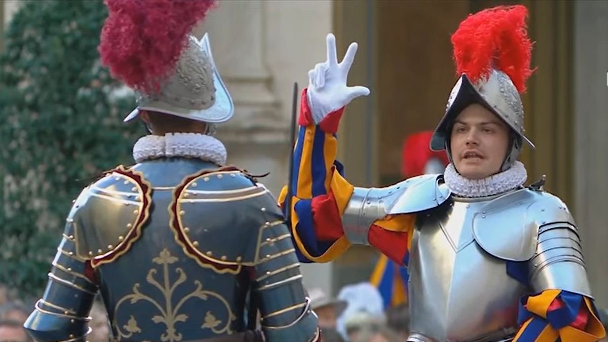 [7:02] Este sábado, en el Patio de San Dámaso del Palacio Apostólico, 27 nuevos soldados de la Guardia Suiza juraron fidelidad al Papa en su presencia, elevando cada uno tres dedos en signo de la Santísima Trinidad, en una ceremonia de gran belleza marcial: