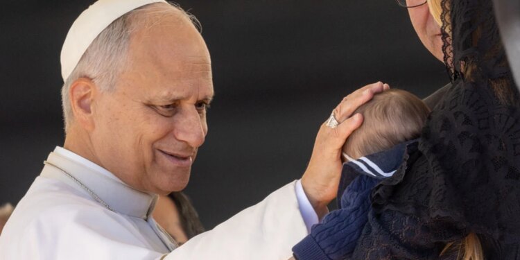 El Papa León XIV bendice un bebé en el Vaticano. / Crédito: Daniel Ibáñez / EWTN News.