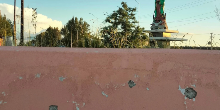 Marcas de bala en glorieta donde se encuentra imagen de la Virgen de Guadalupe. / Crédito: P. Enrique Urzúa