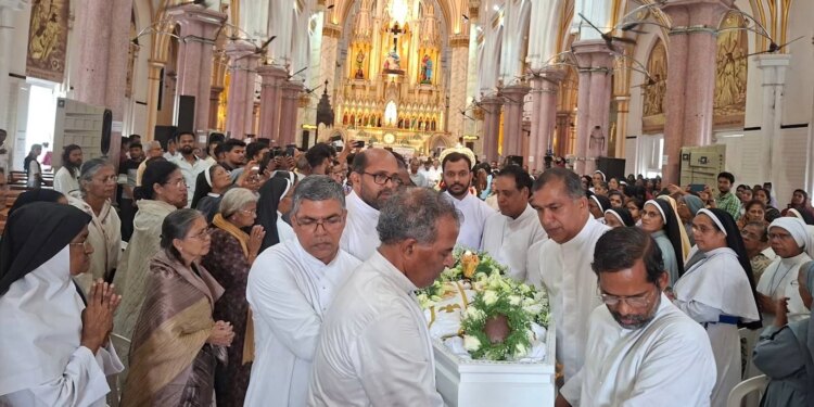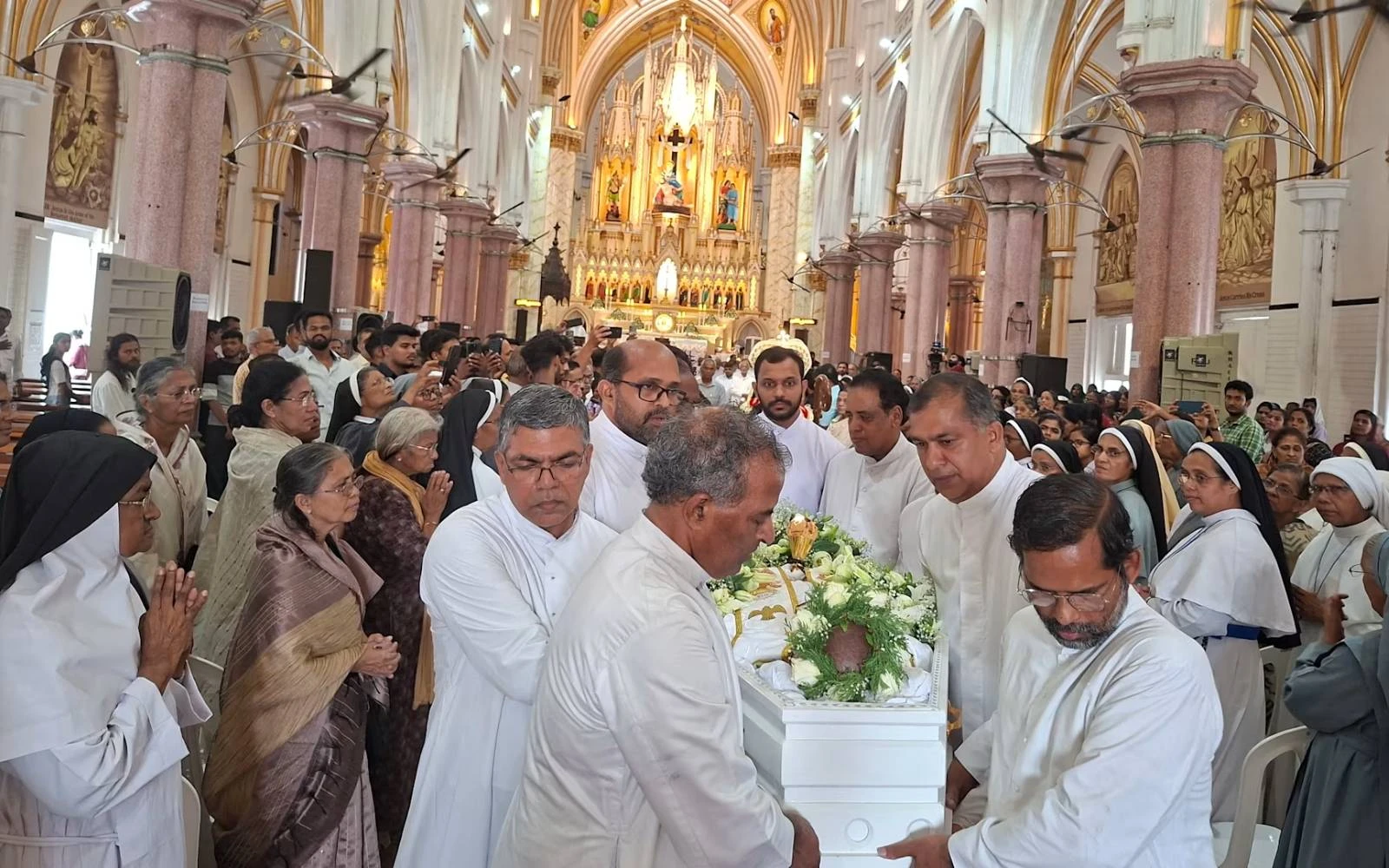 Sacerdotes trasladan el cuerpo del P. Francis Alappatt desde la Basílica de Nuestra Señora de los Dolores en Thrissur, India, tras su funeral el 10 de abril de 2026. / Crédito: Anto Akkara