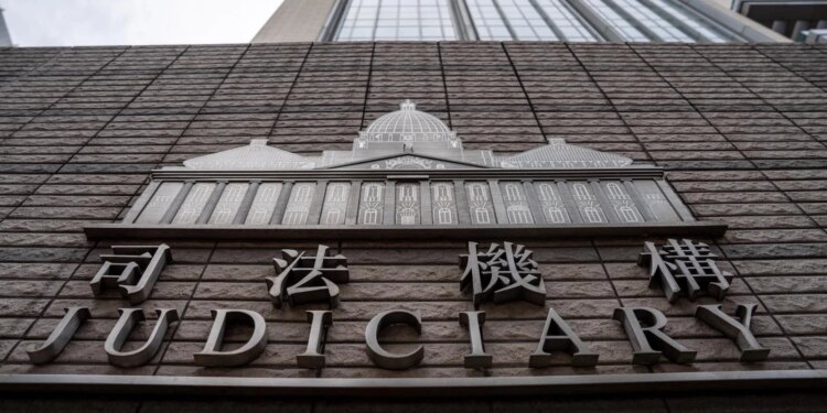 Vista general muestra el letrero del tribunal de West Kowloon, donde se estaba llevando a cabo el juicio por seguridad nacional del encarcelado empresario de los medios de Hong Kong Jimmy Lai, en Hong Kong, el 28 de agosto de 2025. / Crédito: VERNON YUEN/AFP vía Getty Images.