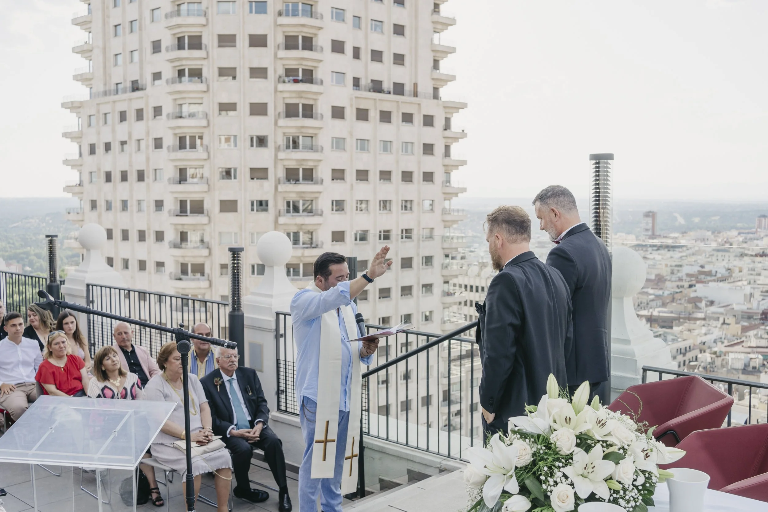 Las fotografías, difundidas en la web de los fotografos del evento, muestran una ceremonia celebrada en la azotea de un edificio de Madrid, con vistas a la catedral de la Almudena. En el acto, una pareja del mismo sexo aparece «celebrando su matrimonio» mientras el cura Josete, amigo íntimo del cardenal Cobo, y responsable hoy de la formación de los profesores de religión en el Instituto de Teología a Distancia, bendice la unión revestido con una estola.
