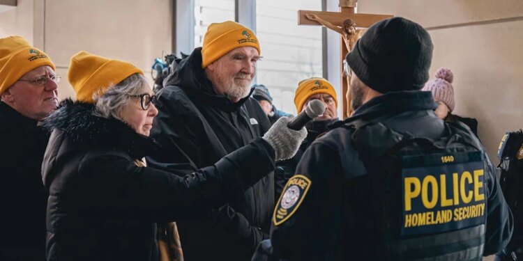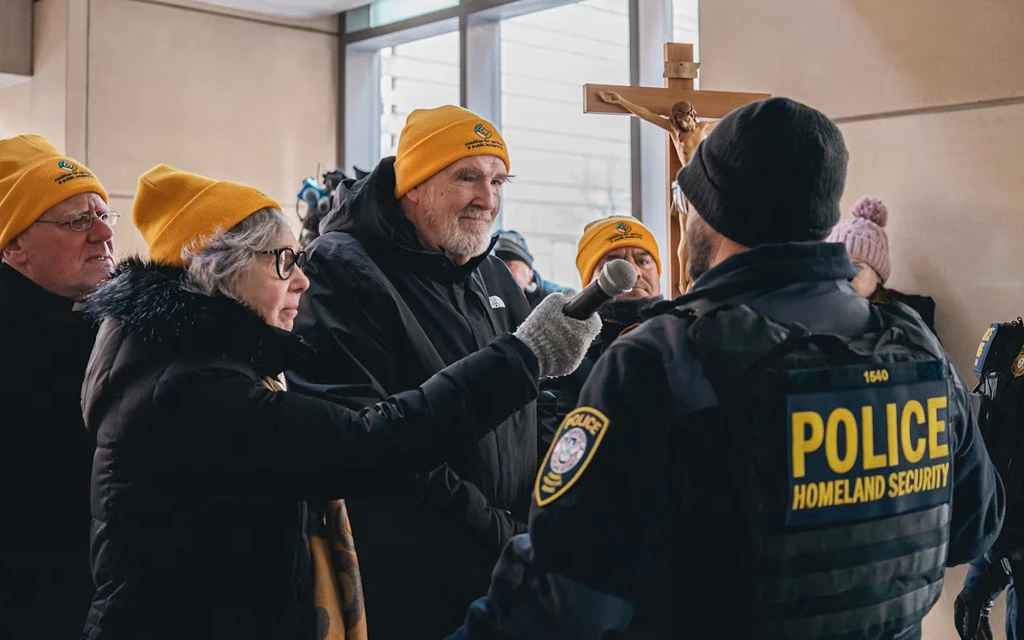 La hermana feliciana Jeremy Marie Midura (izquierda) y el P. Dennis Berry (centro) conversan con un funcionario del Departamento de Seguridad Nacional frente a la oficina local del Servicio de Inmigración y Control de Aduanas de Estados Unidos (ICE) en Chicago el 19 de diciembre de 2025. / Crédito: Foto cortesía de la Coalición para el Liderazgo Espiritual y Público/Bryan Sebastian.