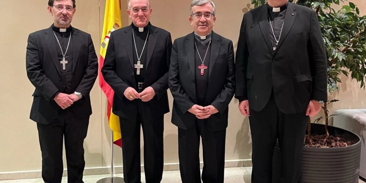El presidente de la CEE, Mons. Luis Argüello; el vicepresidente, Cardenal José Cobo, Arzobispo de Madrid; y el secretario general del órgano de coordinación episcopal español, Mons. Francisco César García Magán, recibieron al diplomático italiano.
