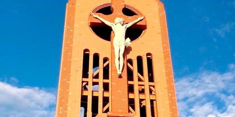 Torre de la iglesia Jesús, María y José con el Cristo de la Esperanza. / Crédito: parroquia Jesús, María y José de Quimbaya.