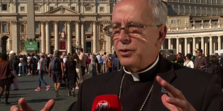 El Obispo de El Paso, Texas (Estados Unidos), Mons. Mark Seitz, conversa con EWTN News el 9 de octubre de 2025, en el Vaticano. / Crédito: EWTN News.
