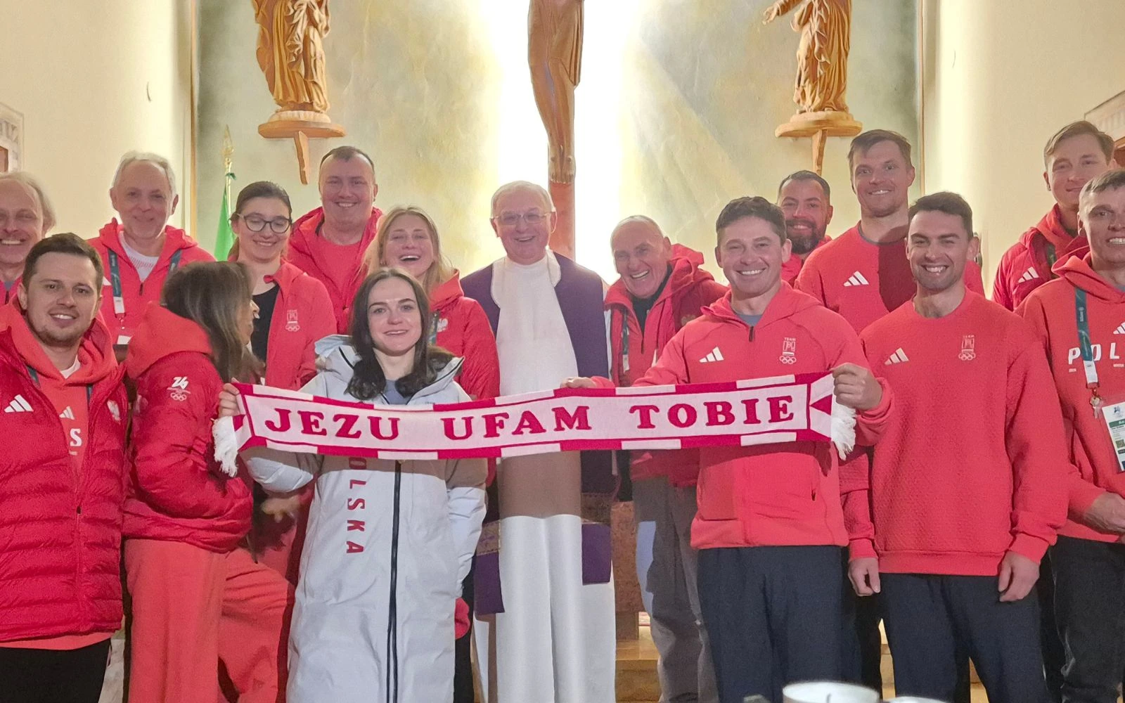 El P. Edward Pleń junto a los atletas polacos en los Juegos Olímpicos de Cortina, quienes sujetan una bandera con la frase «Jesús, en ti confío» / Crédito: Cortesía del P. Edward Pleń