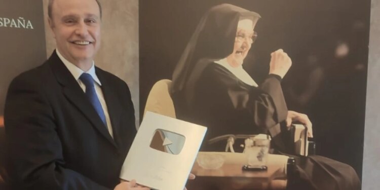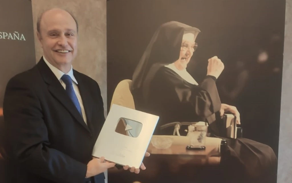 José Carlos González-Hurtado, presidente de EWTN España, con la placa que reconoce que han superado los 100.000 suscriptores en YouTube. / Crédito: EWTN España.