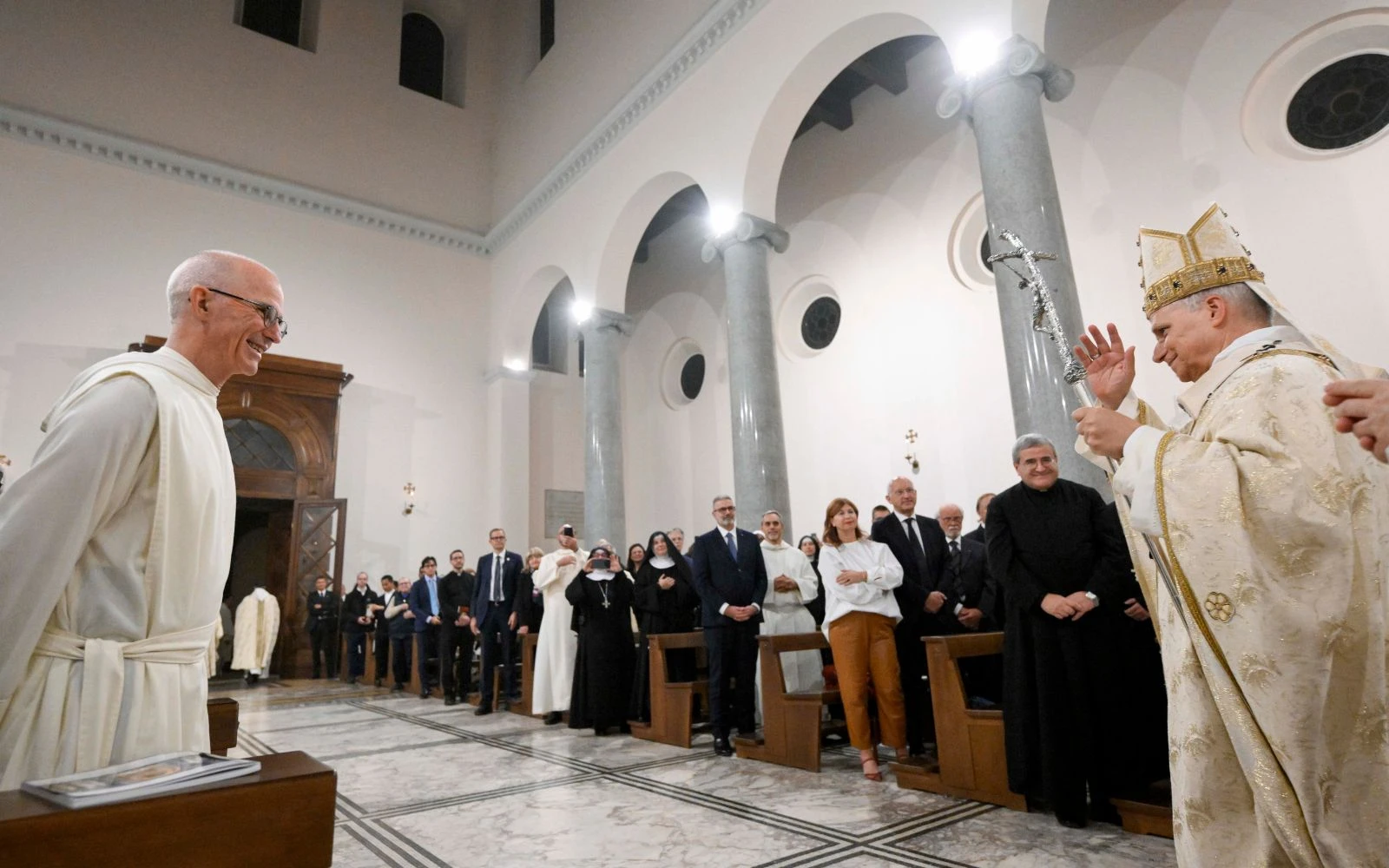 Los monjes benedictinos recibieron a León XIV el pasado 11 de noviembre de 2025, coincidiendo con la festividad de la dedicación de la iglesia de San Anselmo, de donde parte la peregrinación / Crédito: Vatican Media