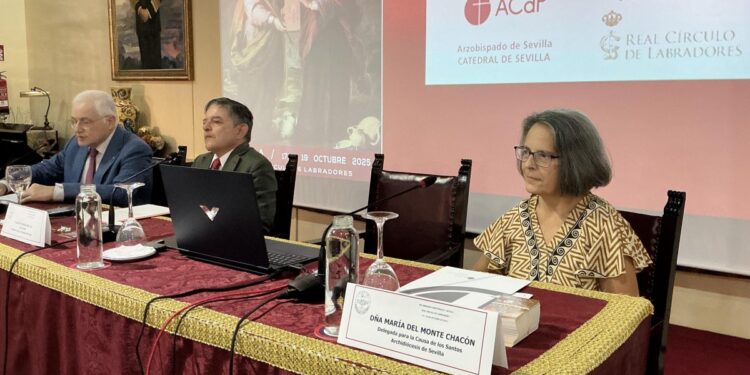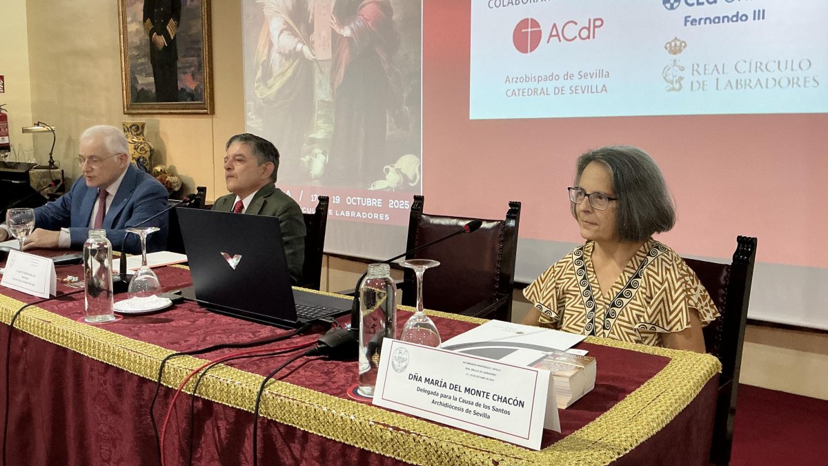 María del Monte Chacón, delegada episcopal para las Causas de los Santos ha sido la encargada de recibir a los jornalistas antes de la primera ponencia con la que se acaban de inaugurar en el espectacular Salón Real del Círculo de Labradores de Sevilla (calle de Labradores esquina Sierpes) las XIII Jornadas Martiriales: Los mártires, peregrinos de la esperanza.
