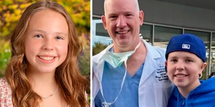 Sophia Forchas, sobreviviente del tiroteo en la escuela la Anunciación, en una foto antes del incidente y después del ataque, junto al neurocirujano Walt Galicich en el Hospital Infantil Gillette de Minneapolis. / Crédito: Foto cortesía de la familia Forchas