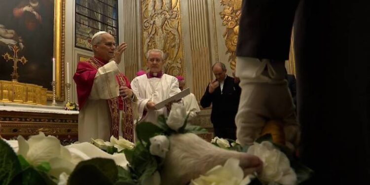 Esta mañana, en la Capilla de Urbano VIII, se han presentado al Papa dos corderos que serán bendecidos con motivo de la memoria litúrgica de Santa Inés y con los que se confeccionan los palios que impondrá él a los arzobispos