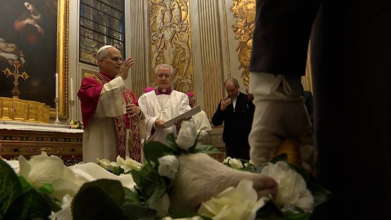 Esta mañana, en la Capilla de Urbano VIII, se han presentado al Papa dos corderos que serán bendecidos con motivo de la memoria litúrgica de Santa Inés y con los que se confeccionan los palios que impondrá él a los arzobispos