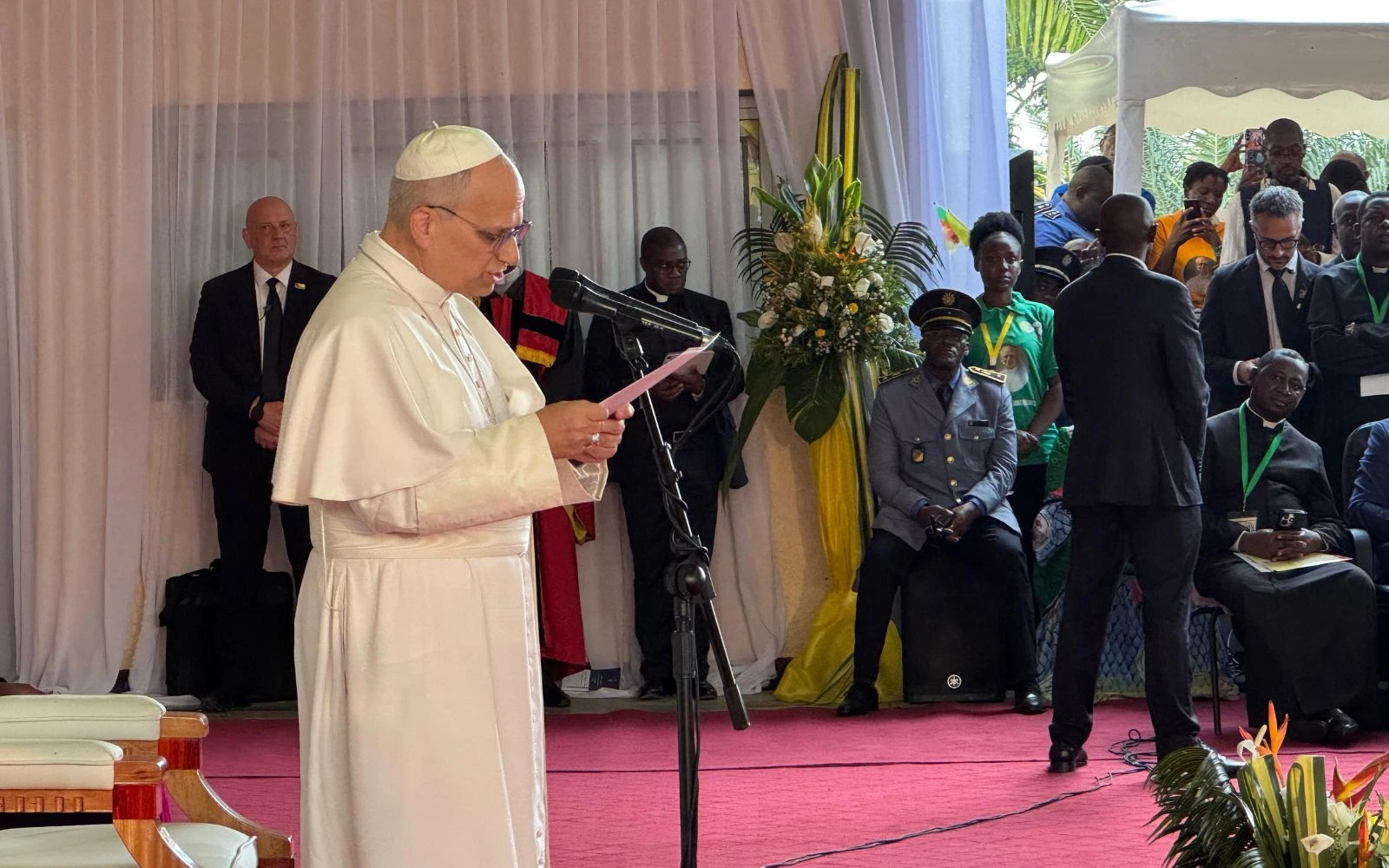 El Papa León XIV lee su discurso en la Universidad Católica de África central este 17 de abril / Crédito: EWTN