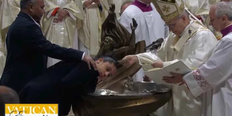 El Papa León XIV bautiza una catecúmena en la Vigilia Pascual este Sábado Santo en el Vaticano. / Crédito: EWTN / ACI Prensa.