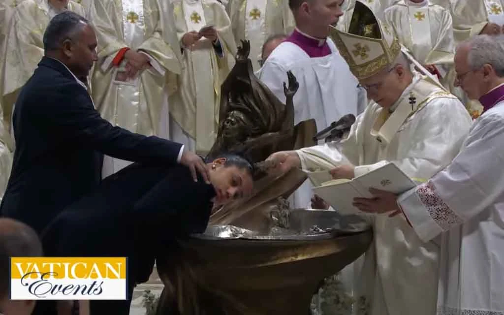 El Papa León XIV bautiza una catecúmena en la Vigilia Pascual este Sábado Santo en el Vaticano. / Crédito: EWTN / ACI Prensa.