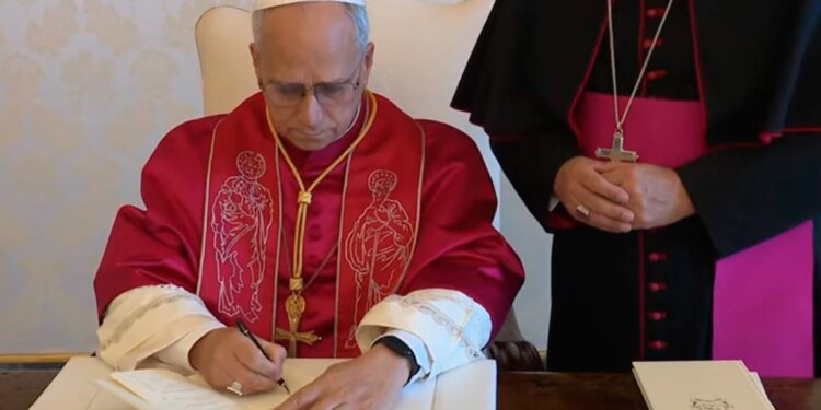 El Papa León XIV firma su primera exhortación apostólica: Dilexit te, sobre el amor a los pobres. / Crédito: Vatican Media.