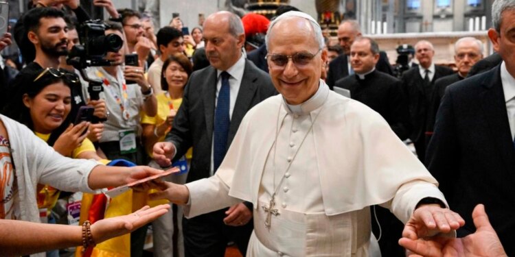 El Papa León XIV en la Basílica de San Pedro durante el encuentro que tuvo con los misioneros digitales durante el Jubileo de la Esperanza. / Crédito: Vatican Media.