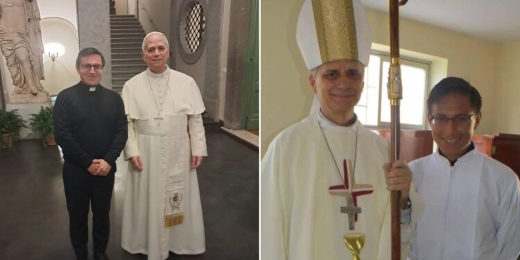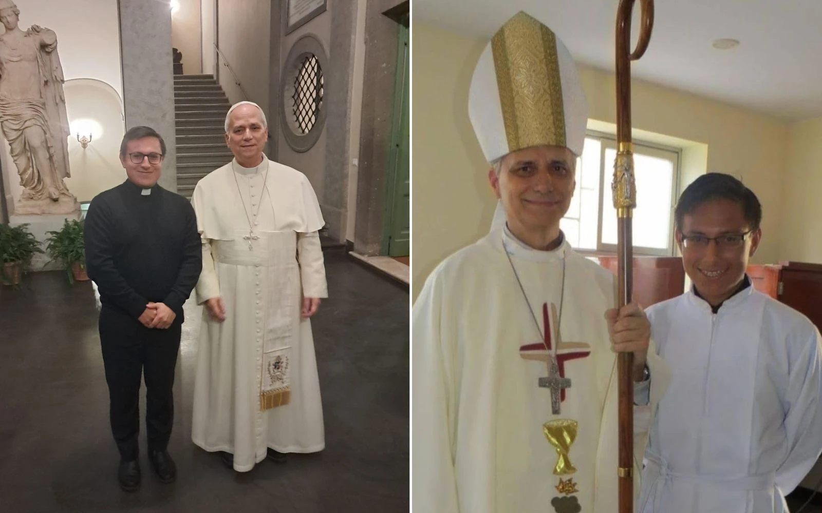 A la izquierda, Édgar Perales con el Papa León este 17 de febrero. A la derecha, junto al entonces Mons. Robert Prevost en Chiclayo (Perú). / Crédito: Cortesía de Édgar Perales.