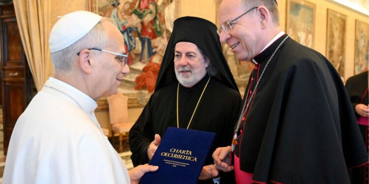 Mons. Gintaras Grušas y el Arzobispo Nikitas Lioulias presentan el documento al Papa León XIV / Crédito: Vatican Media