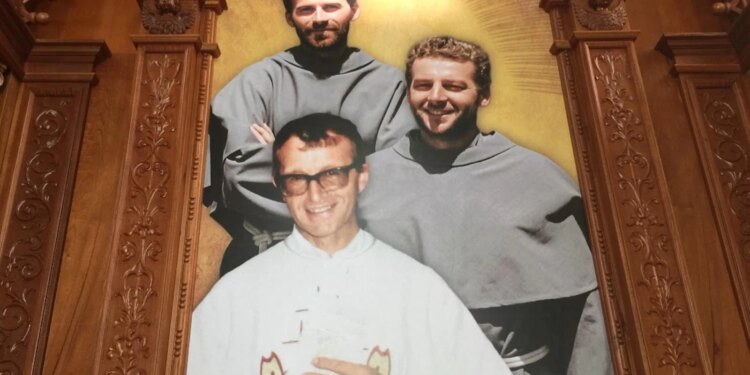 Los beatos mártires Michał Tomaszek, Zbigniew Strzałkowski y Alessandro Dordi, en una imagen en la Catedral de Nuestra Señora del Carmen y San Pedro Apóstol, en Nuevo Chimbote, Áncash (Perú). / Crédito: David Ramos/EWTN News.