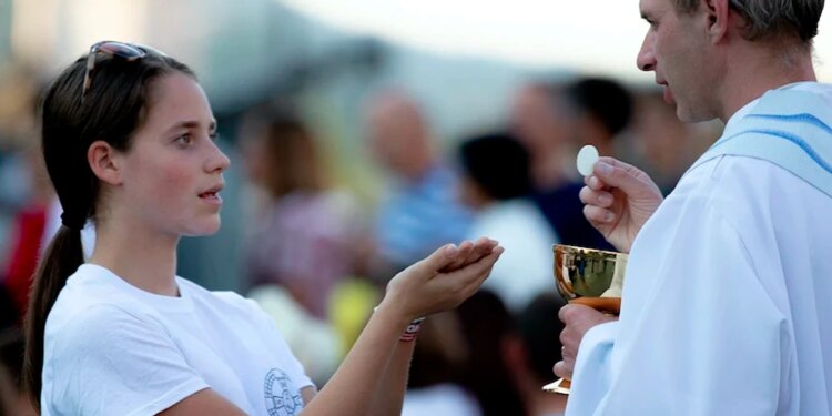 Una fiel recibe la Eucaristía de manos de un sacerdote. / Crédito: Daniel-Ibáñez.